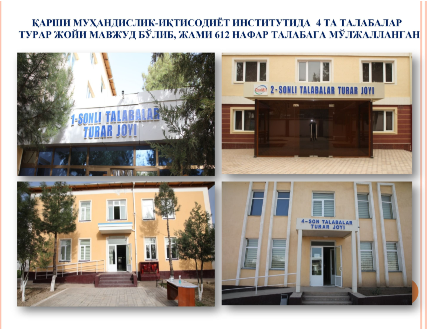 The Karshi Engineering and Economics Institute has 5 student dormitories, where 905 students live today.