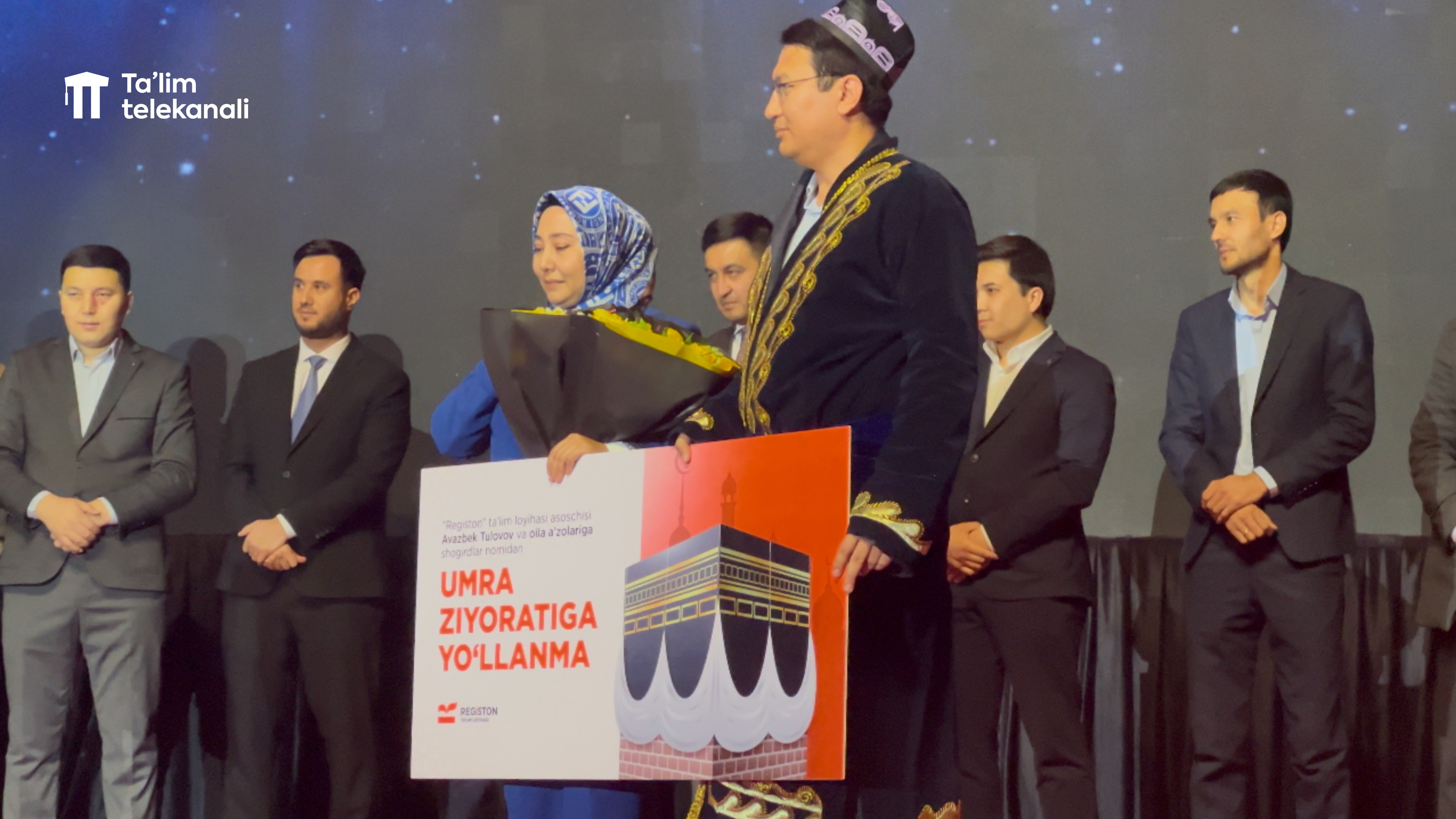 В кульминационный момент вечера команда Регистана подарила своему руководителю Авазбеку Тулову и его супруге Шохидa Давлатовнa путевку в поездку в Умру за заслуги в образовании.