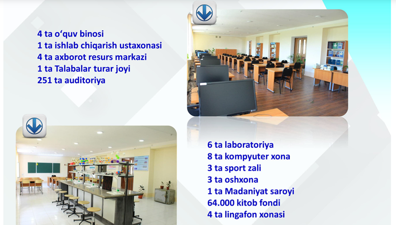 Universitetda 1000 talabaga mo’ljallangan talabalar turar joyi (TTJ) mavjud. Bundan tashqari universitet binosida quyidagilar faoliyat yuritadi: