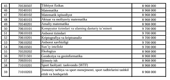 O‘zbekiston Milliy universitetida 2024-2025 o’quv yilidagi bir yillik kontrakt-to‘lov miqdorini quyidagi jadvaldan bilib olishingiz mumkin: