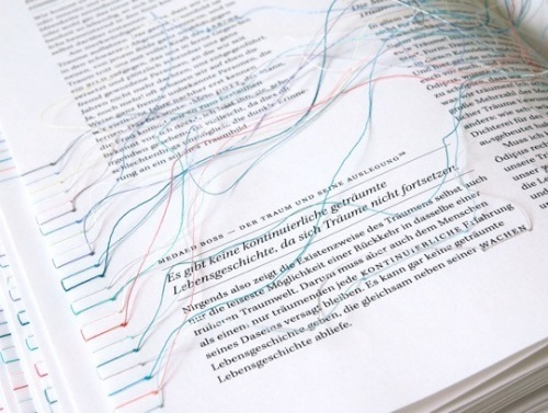 Ушбу ажойиб китоб Мария Фишер томонидан Аугсбург Университетида диплом иши сифатида тайёрланган. “Траумгеданкен” (“Тушлардаги ўйлар”) бир-бири билан ипда тартибли қилиб уланган илмий, фалсафий ва назмий матнларнинг жамланмасидан иборат. Рақамли технологиялар даврида яратилган бу китоб нафақат тушлар мантиғини ифода этади, балки интернетнинг моддий метафорасини ҳам акс эттиради.