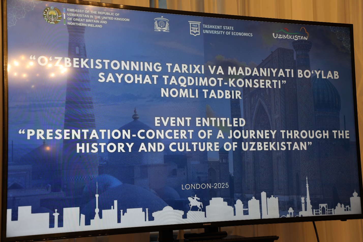 Тошкент давлат иқтисодиёт университети ва Ўзбекистоннинг Буюк Британиядаги элчихонаси ҳамкорлигида ташкил этилган “Ўзбекистоннинг тарихи ва маданияти бўйлаб саёҳат” номли тақдимот-концерти иштирокчиларга унутилмас таассурот ва ҳайрат улашди. Тадбир давомида меҳмонлар мамлакатимизнинг бой тарихи, миллий қадриятлари ва маданий мероси билан яқиндан танишиш имкониятига эга бўлди. Концерт шаклида ўтказилган мазкур тадбир нафақат Ўзбекистоннинг маданий салмоғини намоён қилди, балки юртимизнинг туризм салоҳиятини оширишга хизмат қилди. Миллий қўшиқлар, рақслар ва миллий мусиқа меҳмонларни ҳайратга солиб, уларни Ўзбекистоннинг гўзаллиги ва қадимий анъаналари билан яқиндан таништирди.