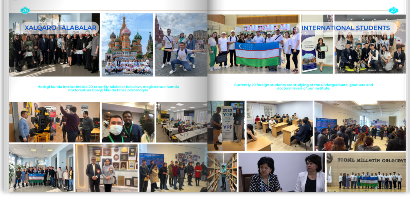 Институт матбуот котиби Эгамназар Абдулбоқиевнинг бизга берган маълумотларига кўра талабалар бўш вақтларини мазмунли ўтказишлари учун ТТЖда инглиз тили ва рус тили фанларидан, талаба-қизлар учун тикиш-бичиш бўйича тўгараклари фаолият юритади. Талабалар турар жойида Президентимиз томонидан илгари сурилган 5 та муҳим ташаббус хоналари ташкил қилиниб, 8000 000 сўм маблаққа кўргазмали стендлар, 5200000 сўм маблаққа мусиқий чолғу асбоблари (дутор, рубоб, доира, пианино) ва 3 500 000 сўмга махсус жавон харид қилинган. Бугунги кунда жами 8648 нафар талабаларга 366 нафар профессор-ўқитувчилар таълим тарбия бериб келмоқда.