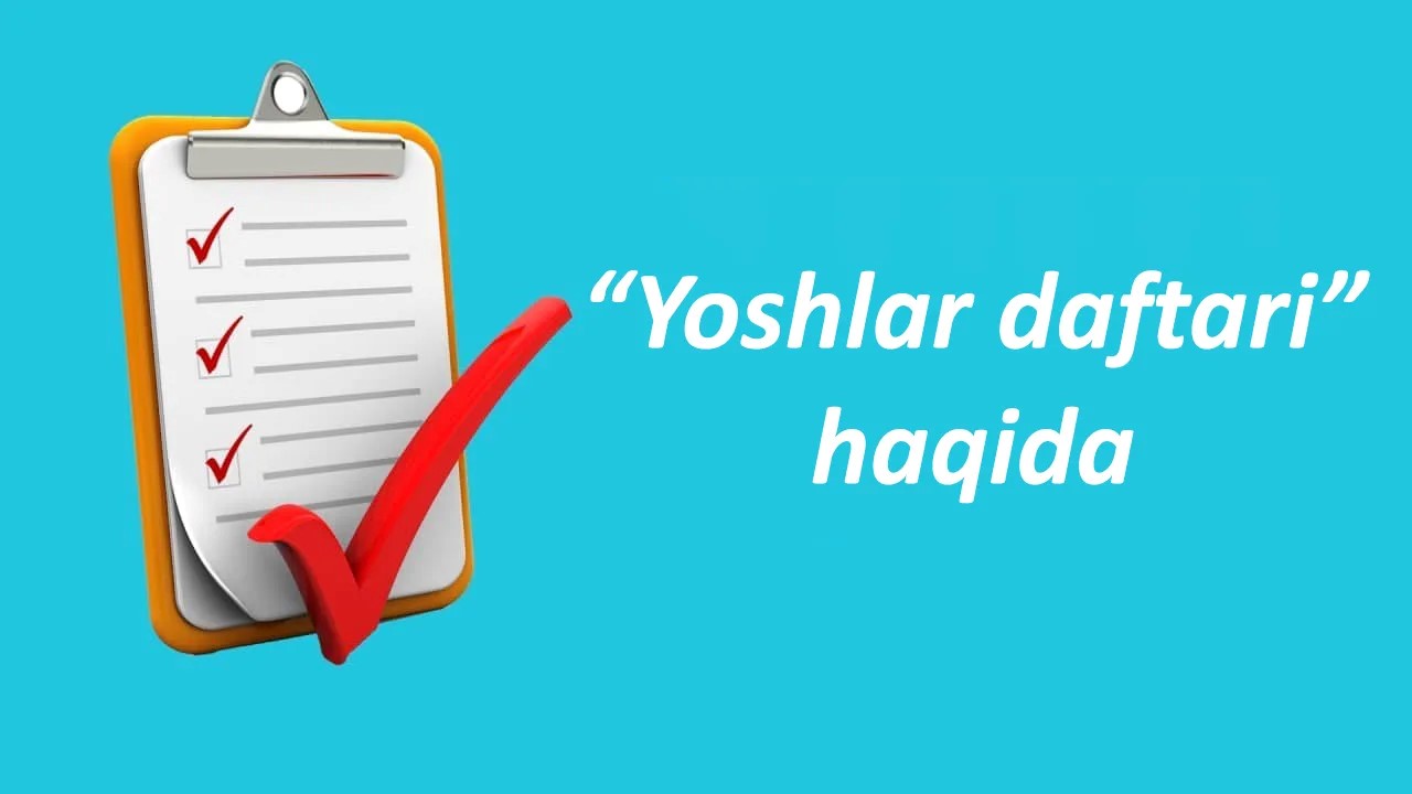 «Ёшлар дафтари» — ижтимоий, иқтисодий, ҳуқуқий, психологик қўллаб-қувватлашга, билим ва касб ўрганишга эҳтиёжи ва иштиёқи бўлган, ишсиз ёшларнинг муаммоларини аниқлаш, бартараф этиш ва назоратини олиб бориш бўйича маълумотлар базаси ҳисобланади. “Ёшлар дафтари”га рўйхатдан ўтиш Ёшлар дафтари электрон платформаси орқали амалга оширилади. Аммо ушбу дафтарга кириш учун ҳам сизнинг қўлингизда асосингиз бўлиши лозим.